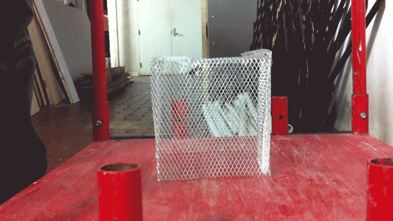 The video illustrates the process of an 8” cube made of diamond grid metal mesh subjected to the intense sudden weight of a bag of rocks.