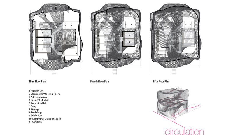 Spatial Possibilities of Structural Skin, Isotropic Space, Rolling Floorplates and Overhead Space.