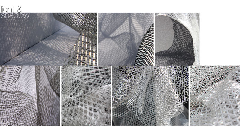 Metal mesh gains a different texture from the impact of weight and gravity. These studies also illustrate light and shadow.