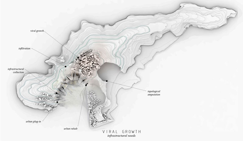 The oldest slum in Rio de Janerio, the Favela de Providenca keeps expanding. In this particularly charged site—sitting in a man-made crater, bordered by favellas, and lacking in infrastructure—a hospital can act as an urban plug-in, filling the existing amenities gap to help foster a healthy, sustainable growth on an urban scale.