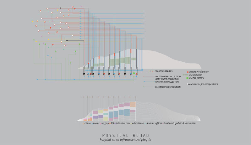 Urban rehab is a proposal for the design of The Rio Super Hospital. “Super” not only implies that the hospital considers its functions and users, but is also rooted in a set of expanding scales that go beyond the building itself.
