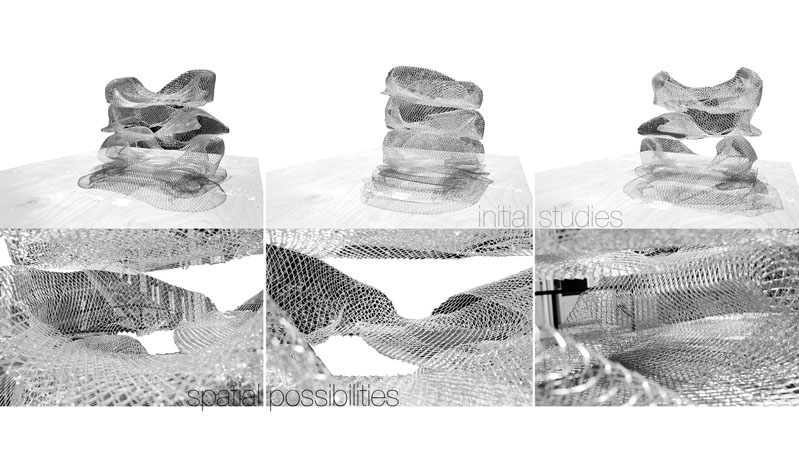 The project uses chance and gravity to invent a relationship between pressure and constraint. Applying weight to a volume with chance allows for the making of space, leaving form as a process of discovery.