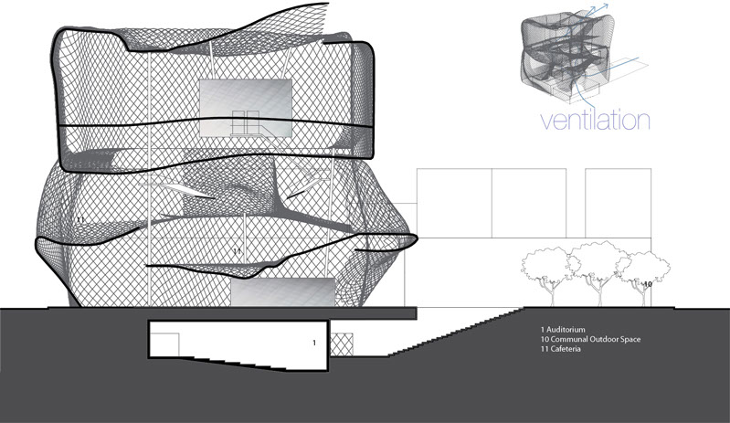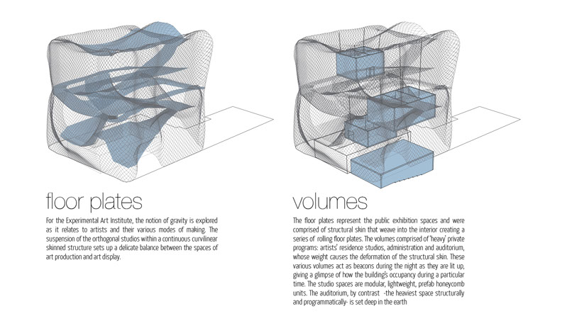 Spatial Possibilities of Structural Skin, Isotropic Space, Rolling Floorplates and Overhead Space.