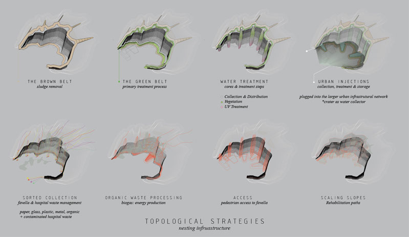The hospital incorporates water and waste management systems, and provides access to rehabilitate the immediate urban context. A system of cores collects water from the site, and enters a process of remediation (beginning with sludge removal, followed by anaerobic digestion and bio filtration). After that, its uses vary from irrigation to mechanical services within the building. Also, methane gas, a by-product of the anaerobic digestion phase combined with organic waste (from the hospital and the favelas) generates electricity in a bio-gas facility at the bottom of the cliff, culminating in a closed-loop cycle.