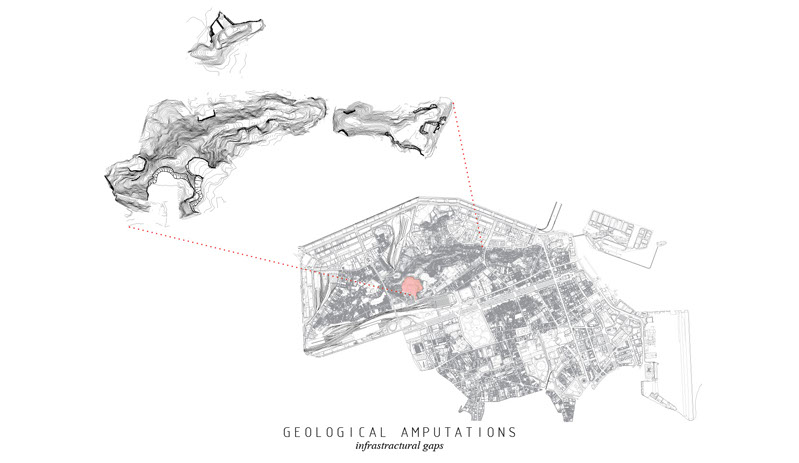 Located in a man-made crater, the Favela de Providenca surrounds the top of the site, while the Central do Brasil (the main train station in Rio de Janeiro), the central bus depot and subway stop lie below it. The topography of Rio de Janerio contains many such craters, which we have marked as geological amputations.